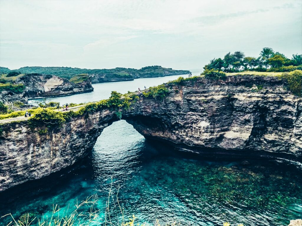 One of the most popular things to do on Nusa Penida is watch the waves swirl inside the cliff bowl that is Broken Beach. It’s right beside Angel’s Billabong so you can easily combine the two. Broken Beach was once a cave but after the roof fell in, it became a unique natural feature with an arched entrance.